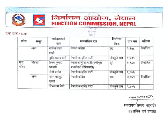 निर्वाचन आयोगले परिणाम सार्वजनिक भएसँगै निर्वाचित उम्मेदवारहरूको विवरण सम्बन्धित निकायहरूमा पठाउने र आगामी प्रक्रिया संविधान तथा प्रचलित कानुनअनुसार अघि बढाइने स्पष्ट पारेको छ ।