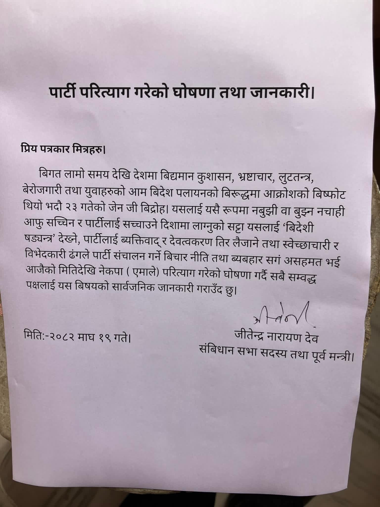 काठमाडौँ । संविधान सभा सदस्य तथा पूर्वमन्त्री जितेन्द्र देवले नेकपा (एमाले) बाट अलग भएको घोषणा गरेका छन्। उनले सार्वजनिक रूपमा जारी गरेको लिखित जानकारीमार्फत आफू अब उक्त दलसँग आबद्ध नरहेको स्पष्ट पारेका हुन्।