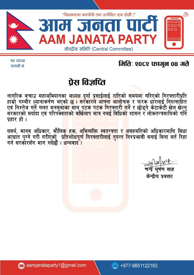 दुर्गा प्रसाईँ पक्राउबारे आम जनता पार्टीको आपत्ति