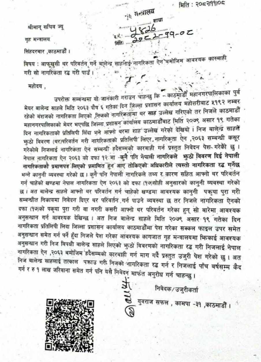 काठमाडौँ महानगरपालिका ३१ का युवराज सफलले गृह मन्त्रालयलाई निवेदन दिँदै साहले नागरिकताको विवरण परिवर्तन गरी नागरिकताको प्रतिलिपि लिएको हुन सक्ने भन्दै अनुसन्धान गर्न माग गरेका हुन् । उनको निवेदन ५४२७ नम्बरमा दर्ता भएको हो ।