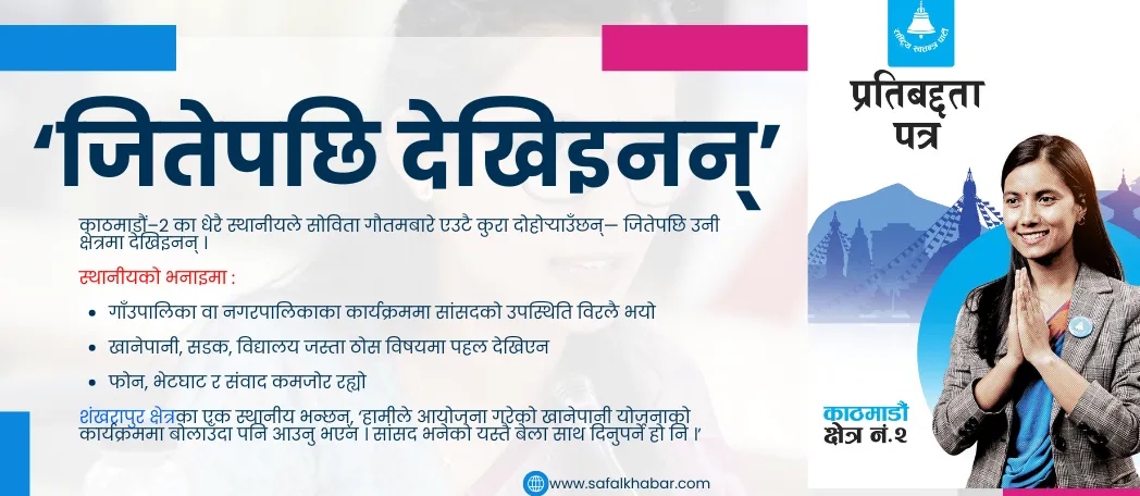कृषि प्रवर्द्धन : साना किसान र आधुनिक कृषि प्रणालीलाई नीतिगत सहयोग कागजमा यी वाचा सशक्त र समयसापेक्ष देखिएका थिए । तर समस्या यहाँबाट सुरु हुन्छ, यी वाचा काठमाडौं–२ का मतदाताले आफ्नो दैनिकीमा कसरी अनुभूति गरे < काठमाडौं–२ का धेरै स्थानीयले सोविता गौतमबारे एउटै कुरा दोहोर्याउँछन्, ‘जितेपछि उनी क्षेत्रमा देखिइनन् ।’ शंखरापुर क्षेत्रका एक स्थानीय भन्छन्, ‘हामीले आयोजना गरेको खानेपानी योजनाको कार्यक्रममा बोलाउँदा पनि आउनु भएन । सांसद भनेको यस्तै बेला साथ दिनुपर्ने हो नि ।’