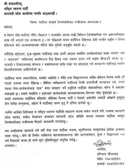 काठमाडौँ । राष्ट्रिय स्वतन्त्र पार्टी (रास्वपा) दोलखाका नेता तथा बागमती प्रदेश समिति सदस्य हरि चौलागाईंले पार्टी परित्याग गरेका छन् ।