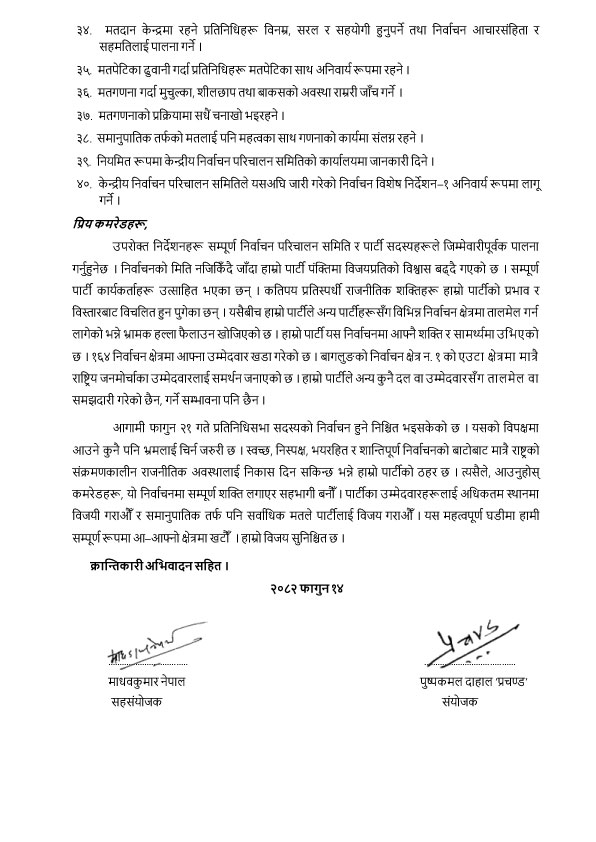 २०८२ फागुन १४ गते जारी गरिएको उक्त निर्देशनमा सहसंयोजक माधवकुमार नेपाल र संयोजक पुष्पकमल दाहाल ‘प्रचण्ड’को हस्ताक्षर छ।
