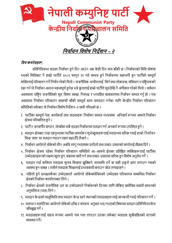 निर्वाचनको अन्तिम तयारीमा पार्टी संरचनालाई पूर्ण रूपमा परिचालित गर्न जारी गरिएको यो निर्देशनलाई नेकपाको चुनावी रणनीतिक दस्तावेजका रूपमा हेरिएको छ।