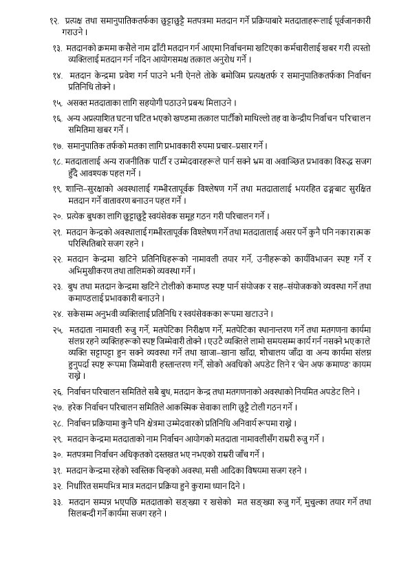 निर्देशनमा प्रत्येक मतदान केन्द्रमा स्वयंसेवक परिचालन गर्न, प्रतिनिधिको नामावली तयार गर्न र स्पष्ट कमाण्ड संरचना कायम गर्न जोड दिइएको छ।