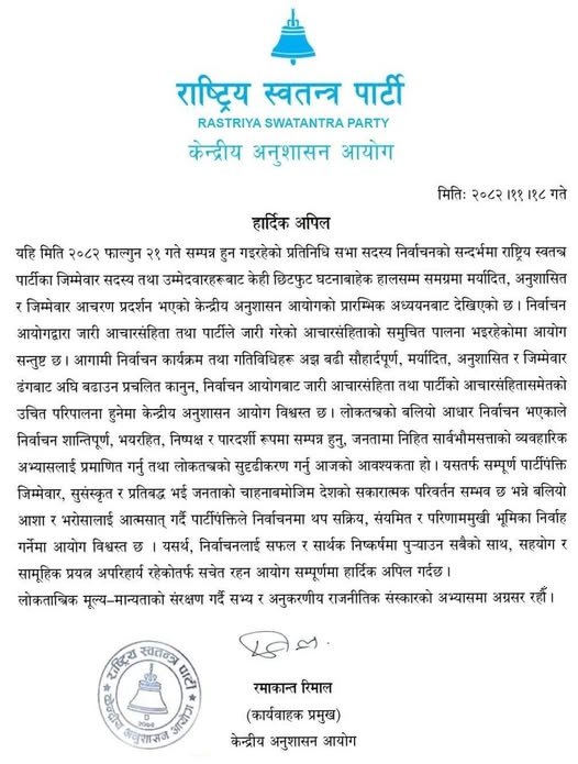 काठमाडौँ । राष्ट्रिय स्वतन्त्र पार्टीले निर्वाचन आयोगद्वारा जारी आचारसंहिता तथा पार्टीले जारी गरेको आचारसंहिता पार्टीका उम्मेदवारहरूले पालना गरेको निष्कर्ष निकालेको छ।