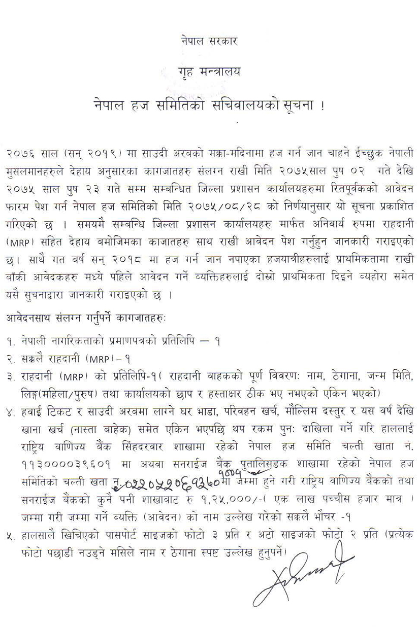 सचिवालयले नेपाल सरकार, गृह मन्त्रालयको वेब साइटमा राखेको सूचना अनुसार हज गर्न मक्का जाने नेपाली मुसलमानले जिल्ला प्रशासन कार्यालयमा गई तोकिएको फारम भरेर आवेदन दिनु पर्नेछ । आवेदनको साथमा नेपाली नागरिकताको प्रमाणपत्र, एमआरपी पासपोर्ट, एक लाख २५ हजार रुपैयाँ बैंकमा जम्मा गरेको भौचर लगायतका कागजपत्र पेश गर्नु पर्नेछ । वेब साइटमा राखिएको नेपाल हज समितिको सचिवालयको सूचनामा यी सबै कुरा विस्तृत रुपमा उल्लेख छ ।
