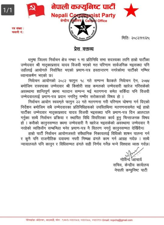 विज्ञप्तिमा भनिएको छ, ‘निर्वाचन आयोग स्वयम्ले फागुन २२ गते मतगणना गरी परिणाम घोषणा गर्न दिएको निर्देशन बमोजिम सबै उम्मेदवारका प्रतिनिधिहरूको उपस्थितिमा मतगणनासमेत भई हाम्रो पार्टीका उम्मेदवार मातृकाप्रसाद यादव विजयी भइसक्दा पनि प्रमाणपत्र दिन आलटाल गर्नुका साथै निर्वाचन प्रक्रिया र स्थापित विधि विपरीतका कार्य हुनु चिन्ताजनक विषय हो । कसैको कानुनसम्मत रूपमा उम्मेदवारी नै खारेज भइसकेको अवस्थामा उम्मेदवार नै नरहेको व्यक्तिसँग सम्बन्धित भनेर प्रमाणपत्र नै वितरण नगर्नु कानुनसम्मत देखिँदैन ।’