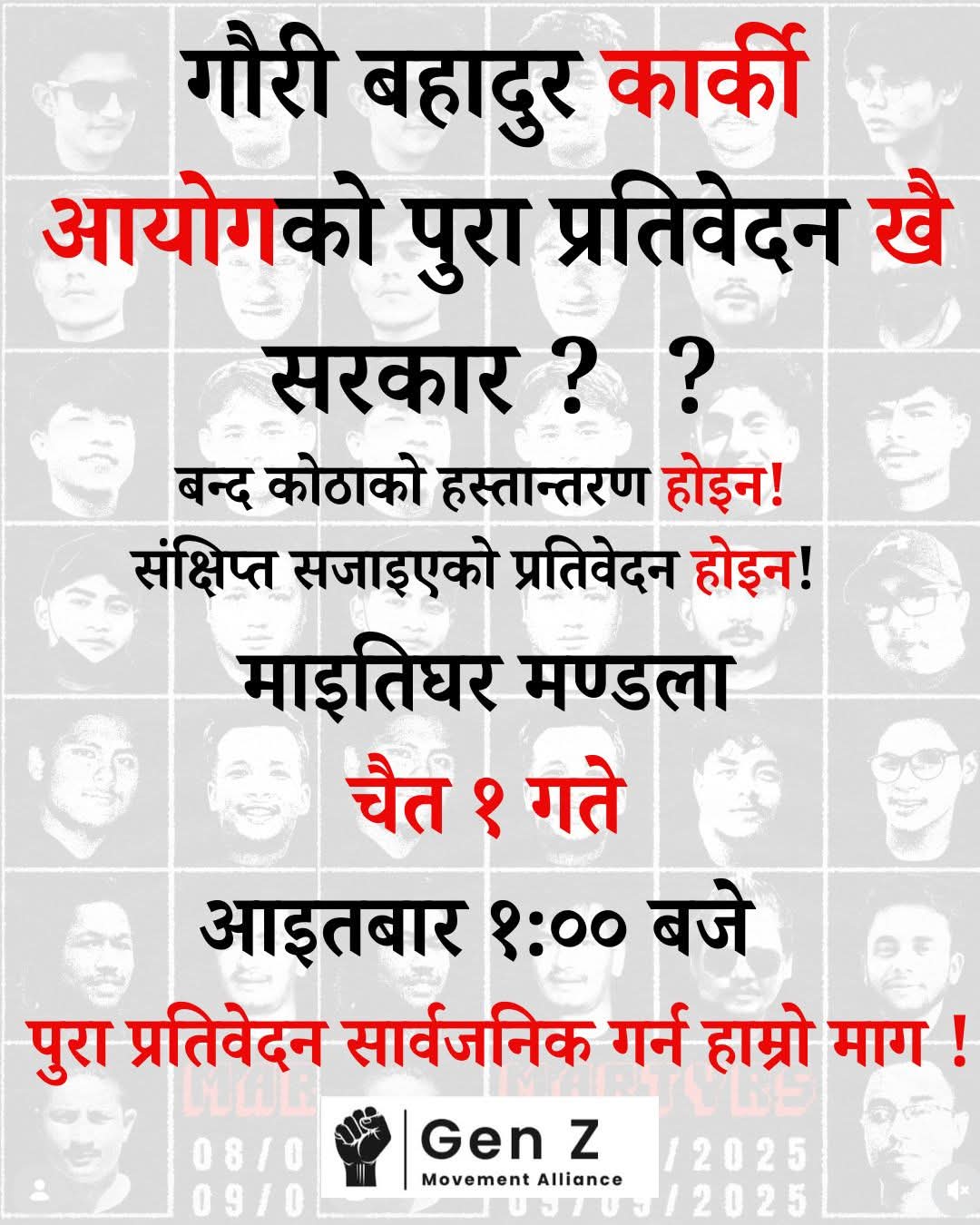 जेन–जी मुभमेन्ट्स एलाइन्सको आयोजनामा आइतबार दिउँसो १ बजे काठमाडौंको माइतीघर मण्डलामा प्रदर्शन गर्ने कार्यक्रम तय गरिएको छ।