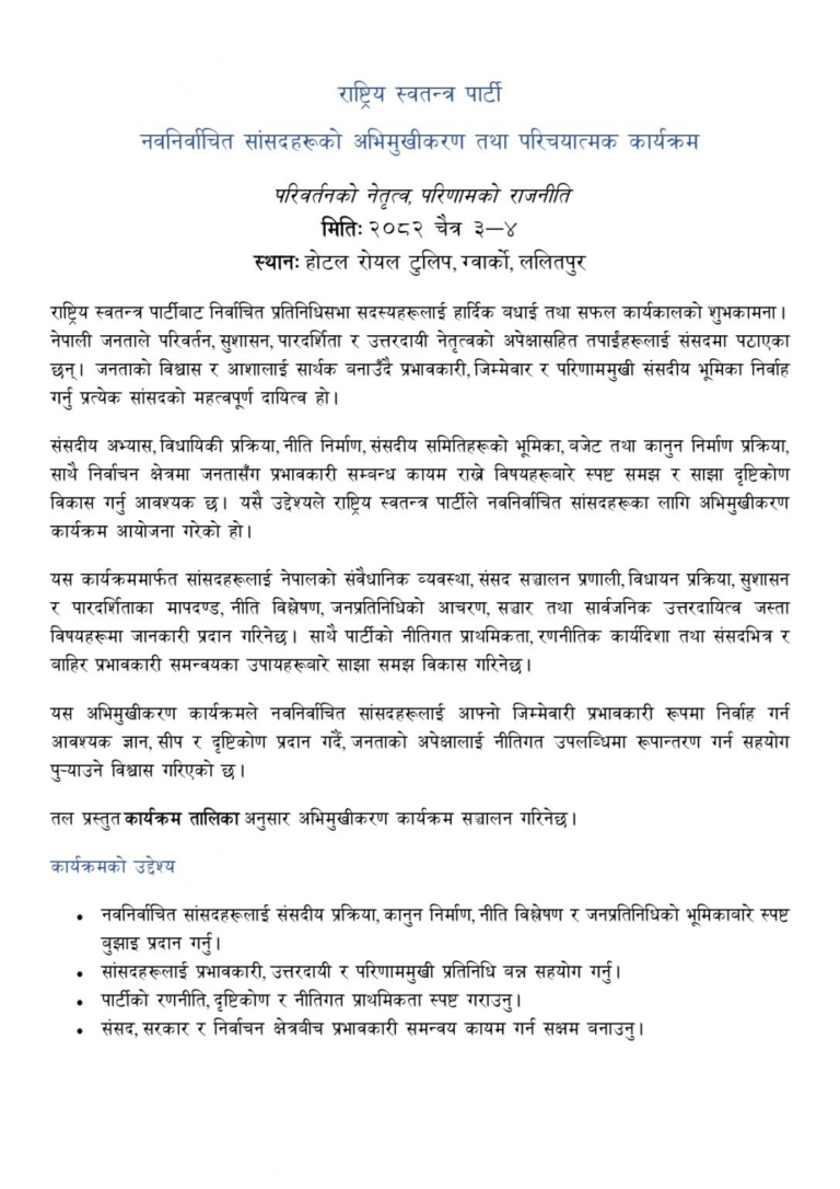 काठमाडौँ । राष्ट्रिय स्वतन्त्र पार्टी (रास्वपा)ले आफ्ना नवनिर्वाचित प्रतिनिधि सभा सदस्यहरूका लागि अभिमुखीकरण आजदेखि सुरु गर्दैछ।