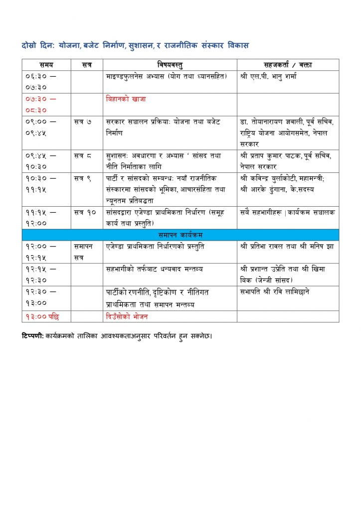 दुई दिने सो अभिमुखीकरणमा सांसदलाई संसदीय अभ्यास, नीति निर्माण, संसद्को कार्यप्रणाली तथा जनप्रतिनिधिको जिम्मेवारी, पार्टीले अवलम्बन गर्नुपर्ने नीति लगायतका बारे जानकारी गराइने पार्टीका प्रवक्ता मनिष झाले जानकारी दिएका छन् ।
