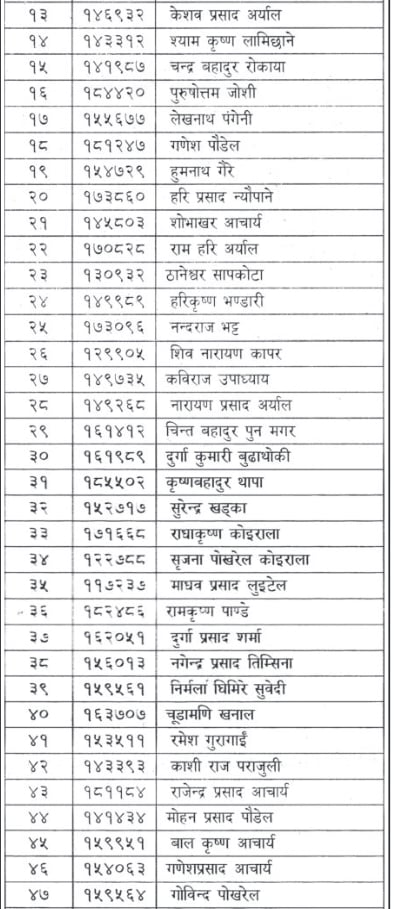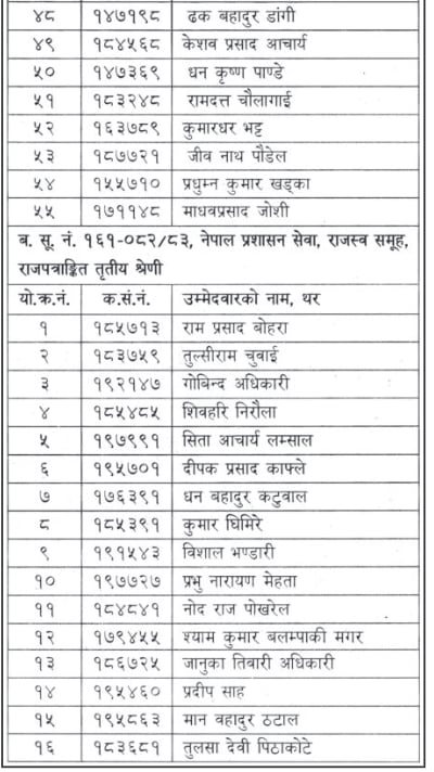 बढुवा समितिको मंगलबारको निर्णयअनुसार नेपाल विविध सेवा, महिला विकाश अधिकृत (राजपत्रांकित तृतीय श्रेणी) अन्तर्गत एक जना, नेपाल प्रशासन सेवा, सामान्य प्रशासन समूह, (राजपत्रांकित तृतीय श्रेणी) अन्तर्गत ५५ जना र नेपाल प्रशासन सेवा, राजस्व समूह, (राजपत्रांकित तृतीय श्रेणी) अन्तर्गत १६ जनालाई अधिकृत पदमा बढुवा सिफारिस गरिएको हो ।