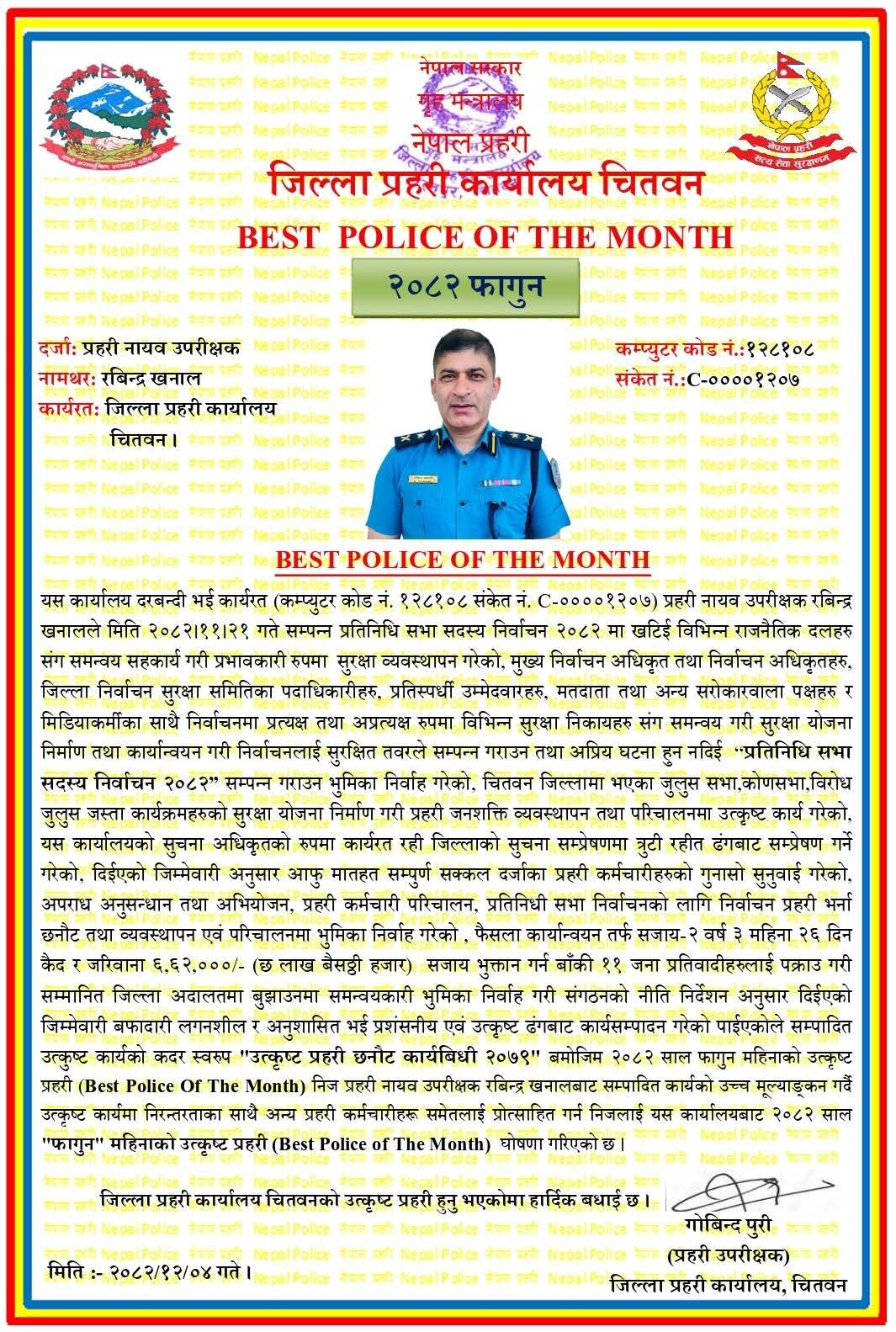 जिल्ला प्रहरी कार्यालय चितवनका अनुसार उत्कृष्ट कार्यसम्पादन, नेतृत्व क्षमता, अनुशासन र जिम्मेवारी बहनको आधारमा खनाललाई ‘फागुन महिनाको उत्कृष्ट प्रहरी’ घोषणा गरिएको हो।