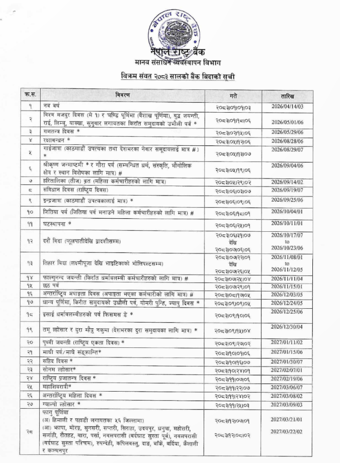 काठमाडौँ । नेपाल राष्ट्र बैंकले आर्थिक वर्ष २०८३ का लागि लागू हुने बैंक बिदा तथा सेवा सञ्चालनसम्बन्धी तालिका सार्वजनिक गरेको छ।