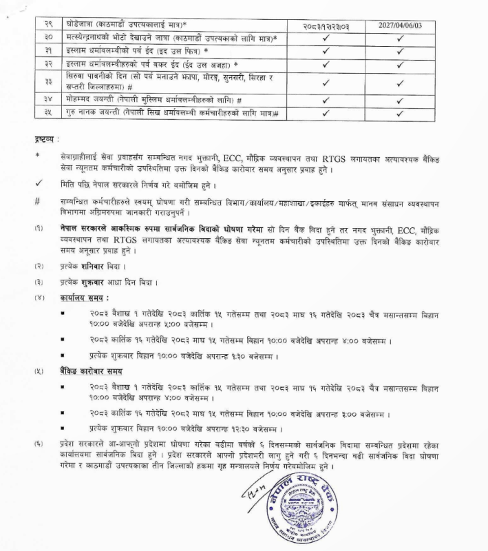 त्यस्तै बैंकिङ कारोबार सञ्चालनको समय पनि मौसमअनुसार समायोजन गरिएको छ। वैशाख १ देखि कात्तिक १५ सम्म तथा माघ १६ देखि चैत मसान्तसम्म कारोबार समय बिहान १० बजेदेखि साँझ ४ बजेसम्म रहनेछ। कात्तिक १६ देखि माघ १५ सम्म भने कारोबार समय बिहान १० बजेदेखि दिउँसो ३ बजेसम्म रहनेछ।