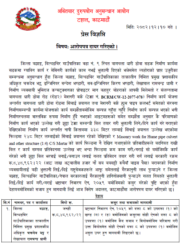 आयोगको केन्द्रिय कार्यालयले हिजो मंगलवार बझाङको बित्थडचिर गाउँपालिकाका तत्कालीन निमित्त प्रमुख प्रशासकीय अधिकृत चक्रदेव भट्टसहित ५ जनाविरुद्ध गैर कानुनी लाभ वा हानि पुर्याई भ्रष्टाचार गरेको आरोपमा मुद्दा दायर गरेको हो ।
