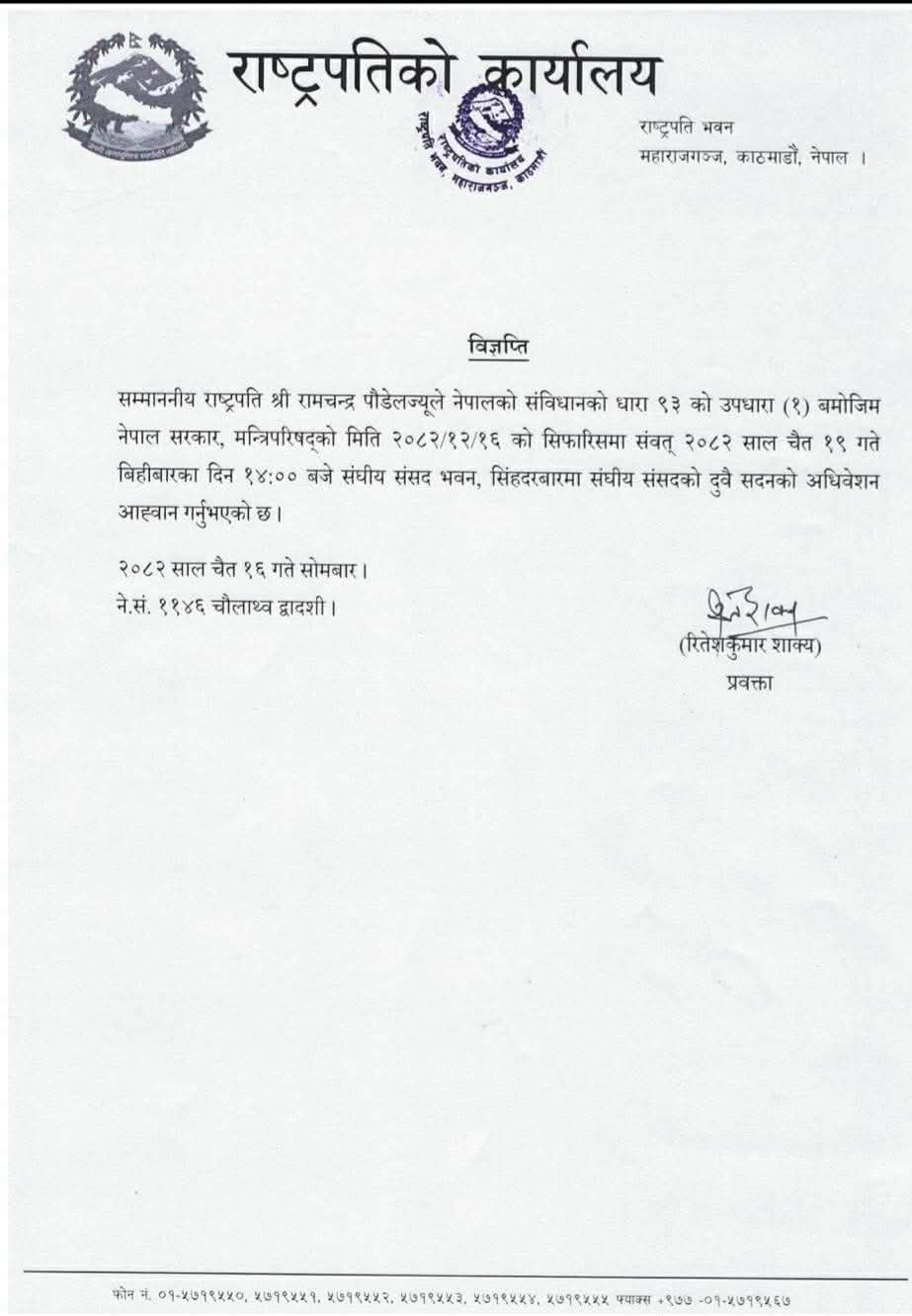 सोही निर्णयका आधारमा राष्ट्रपति पौडेलले अधिवेशन आह्वान गरेको राष्ट्रपति कार्यालयका प्रवक्ता रितेशकुमार शाक्यले जानकारी दिए ।