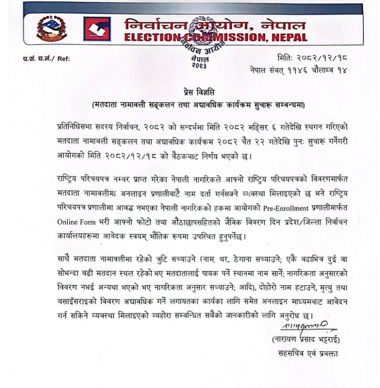विज्ञप्तिमा उल्लेख छ कि राष्ट्रिय परिचयपत्र प्राप्त नेपाली नागरिकले आफ्नो राष्ट्रिय परिचयपत्र विवरणमार्फत अनलाइन प्रणालीबाटै मतदाता नामावलीमा नाम दर्ता गर्न सक्ने व्यवस्था मिलाइएको छ।