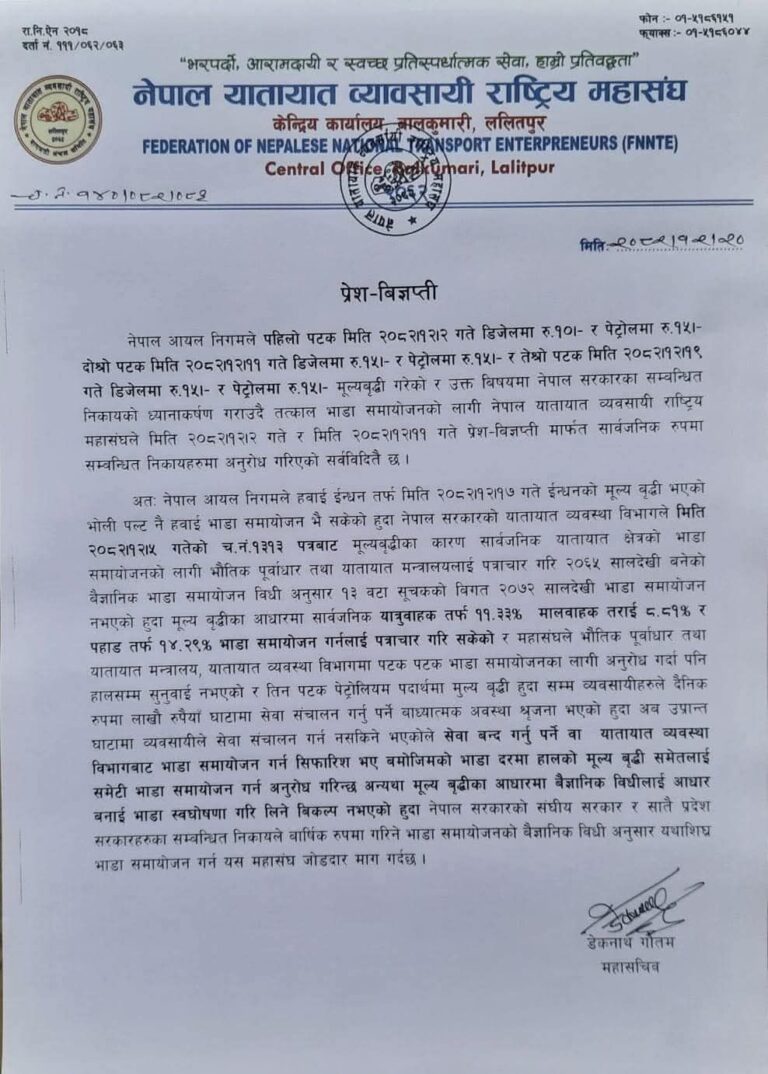 विज्ञप्तिमा २०७२ सालदेखि लागत निर्धारणका प्रमुख सूचकहरूका आधारमा नियमित भाडा समायोजन हुन नसकेको र हाल व्यवसायीहरूले दैनिक आर्थिक घाटा व्यहोर्नुपरेको अवस्था रहेको उल्लेख गरिएको छ।