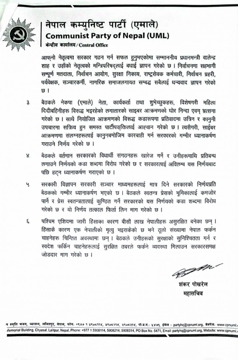 साथै, हिजो (बिहीबार) प्रतिनिधि सभामा नेता बादलले व्यक्त गरेको विवादास्पद अभिव्यक्तिलाई सच्याउनेसम्बन्धी कदम उठाउने निर्णय पनि बैठकले गरेको छ।
