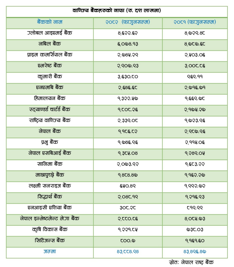 समग्र बैंकिङ प्रणालीको विश्लेषण गर्दा सञ्चालनमा रहेका २० वाणिज्य बैंकमध्ये केवल ९ वटा संस्थाले मात्र नाफा वृद्धि गर्न सकेका छन् भने बाँकी ११ बैंकहरूको नाफा घटेको अवस्था रहेको छ।