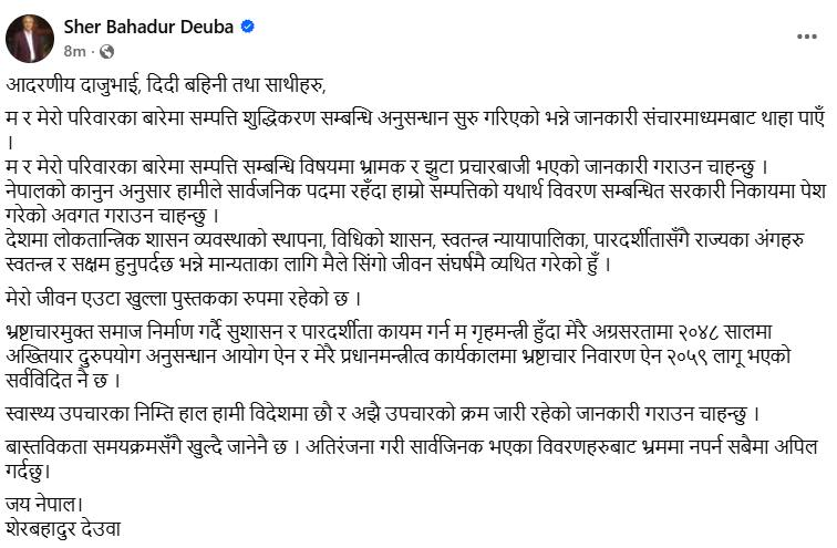 देउवाले प्रचलित कानुनअनुसार सार्वजनिक पदमा रहँदा आफ्नो सम्पत्तिको यथार्थ विवरण सम्बन्धित निकायमा पेश गरिएको जनाएका छन्। लोकतान्त्रिक शासन व्यवस्था, विधिको शासन, स्वतन्त्र न्यायपालिका र पारदर्शितामा आधारित प्रणालीप्रति आफ्नो निरन्तर प्रतिबद्धता रहेको उल्लेख गर्दै राज्यका अंगहरू स्वतन्त्र र सक्षम हुनुपर्ने धारणा उनले राखेका छन्।