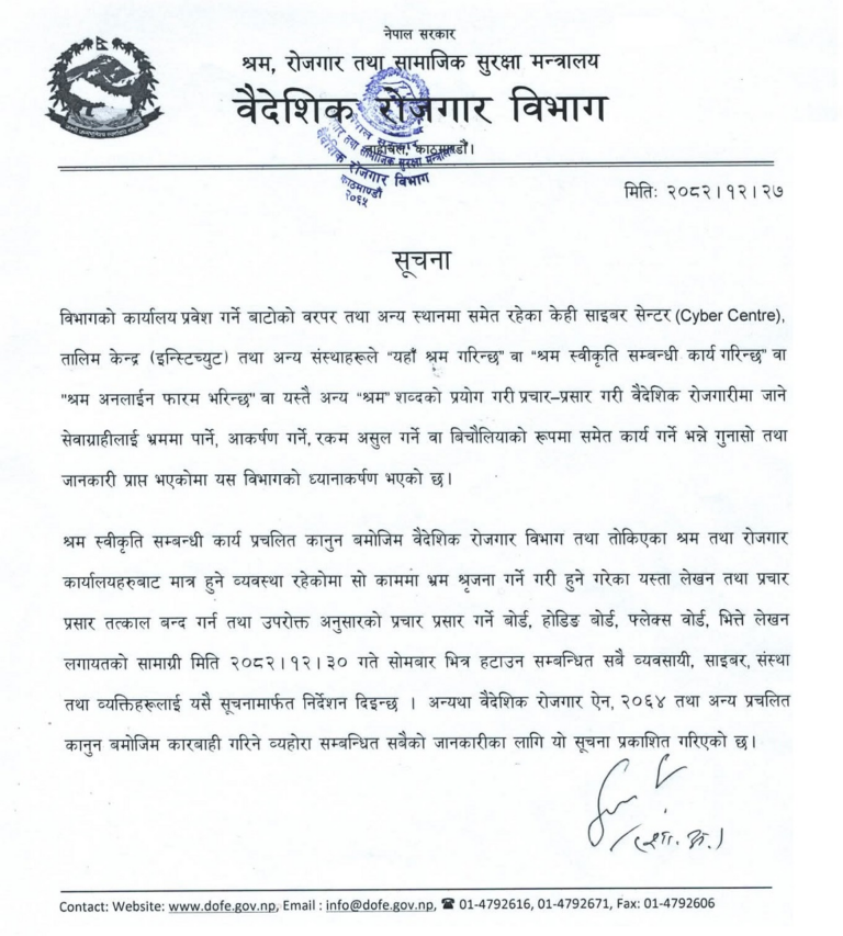 सार्वजनिक सूचना जारी गर्दै विभागले श्रम स्वीकृति सम्बन्धी सम्पूर्ण प्रक्रिया प्रचलित कानुनअनुसार केवल विभाग वा तोकिएका श्रम तथा रोजगार कार्यालयमार्फत मात्र हुने स्पष्ट पारेको छ। यसबाहेक अन्य निकायले यस्तो सेवा प्रदान गर्छु भन्ने गरी प्रचार गर्नु गैरकानुनी हुने पनि विभागले जनाएको छ।