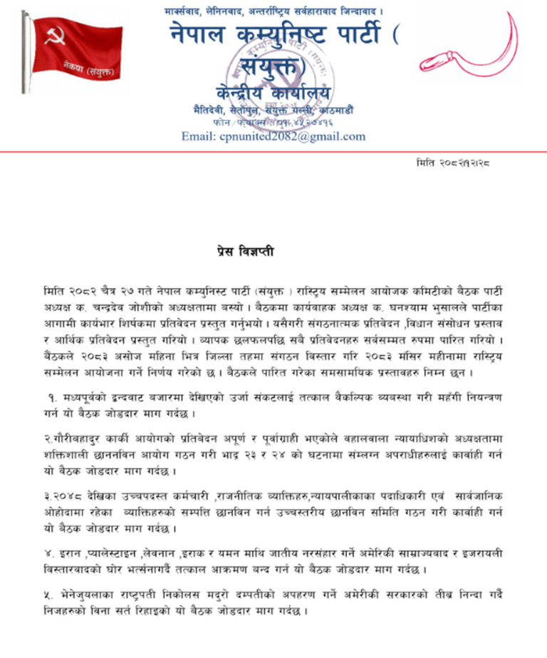 काठमाडौँ । नेकपा संयुक्तले भदौ २३ र २४ गतेको घटनामा गौरीबहादुर कार्की आयोगको प्रतिवेदन अस्वीकार गरेको छ।