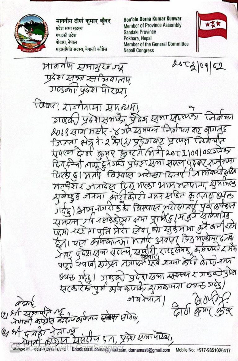 काठमाडौँ । नेपाली काँग्रेसका प्रदेश सभा सदस्य दोर्णकुमार कुँवरले आफ्नो पदबाट राजीनामा दिएका छन्।