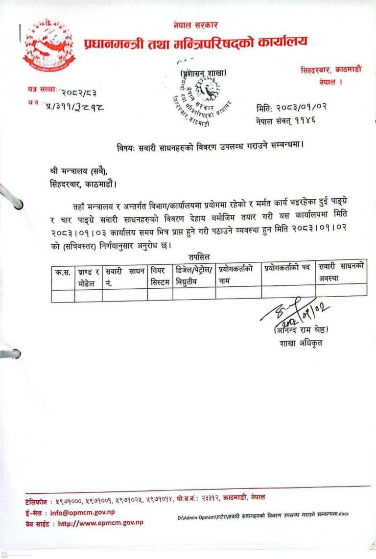 मन्त्रालय तथा अन्तर्गतका विभाग रकार्यालयहरूले प्रयोगमा रहेका दुई पाङ्ग्रे र चार पाङ्ग्रे सवारी साधनहरूको विवरण तोकिएको ढाँचामा तयार गरी कार्यालयमा उपलब्ध गराउन भनिएको हो ।