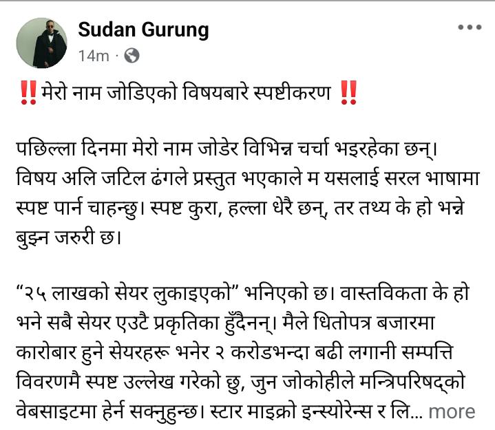 मेरो नाम जोडिएको विषयबारे स्पष्टीकरण:पछिल्ला दिनमा मेरो नाम जोडेर विभिन्न चर्चा भइरहेका छन्। विषय अलि जटिल ढंगले प्रस्तुत भएकाले म यसलाई सरल भाषामा स्पष्ट पार्न चाहन्छु। स्पष्ट कुरा, हल्ला धेरै छन्, तर तथ्य के हो भन्ने बुझ्न जरुरी छ।