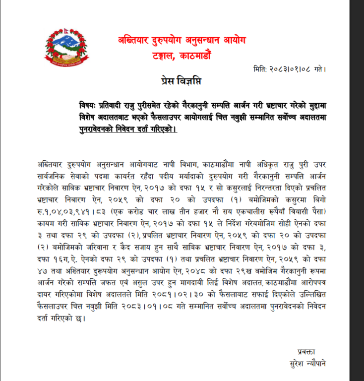 पुरीविरुद्धको भ्रष्टाचार मुद्दामा विशेष अदालतबाट भएको फैसलाउपर आयोगलाई चित्त नबुझी सर्वोच्च अदालतमा पुनरावेदन गरिएको आयोगका प्रवक्ता सुरेश न्यौपानेले जानकारी दिए ।