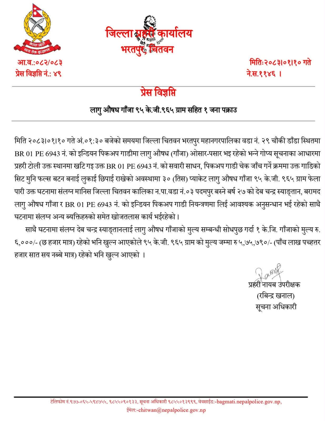 प्रहरीका अनुसार गोप्य सूचनाको आधारमा भरतपुर महानगरपालिका–१९ स्थित चेकजाँचका क्रममा भारतीय नम्बर प्लेटको पिकअप गाडी (BR 01 PE 6943) बाट ९५.१६५ केजी गाँजा बरामद गरिएको हो।