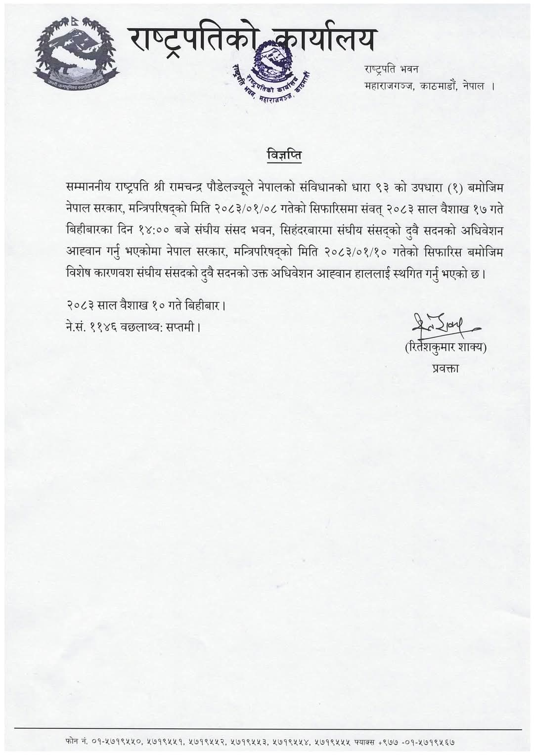 राष्ट्रपति कार्यालयका प्रवक्ता रितेशकुमार शाक्यका अनुसार बिहीबार बसेको मन्त्रिपरिषद् बैठकले संसद बैठक स्थगित गर्न सिफारिस गरेको थियो।