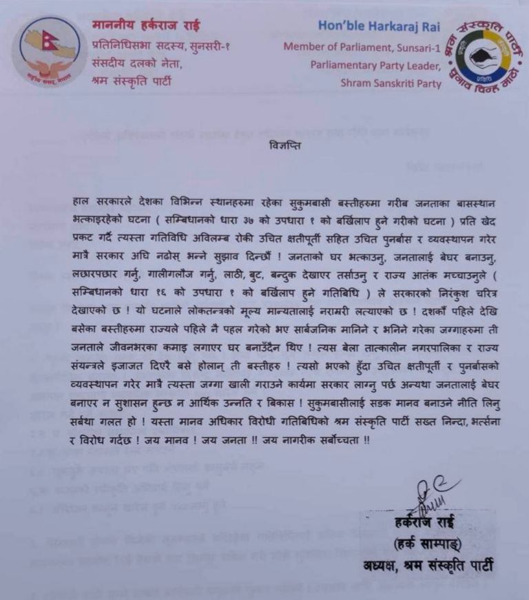 विज्ञप्तिमा भनिएको छ, ‘जनताको घर भत्काउनु, जनतालाई बेघर बनाउनु, लछारपछार गर्नु, गालीगलौज गर्नु, लाठी, बुट र बन्दुक देखाएर तर्साउनु र राज्य आतंक मच्चाउनुले सरकारको निरंकुश चरित्र देखाएको छ।’