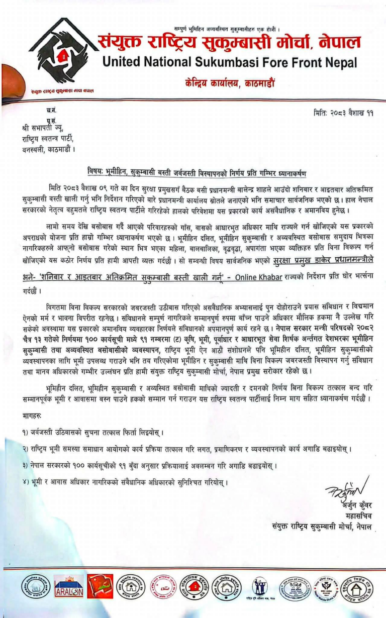 मोर्चाका महासचिव अर्जुन कुँवरले भूमिहीन तथा सुकुम्वासी समुदायलाई बलपूर्वक विस्थापन गर्ने तयारीप्रति आपत्ति जनाउँदै तत्काल पुनर्विचार गर्न आग्रह गरेका छन्।