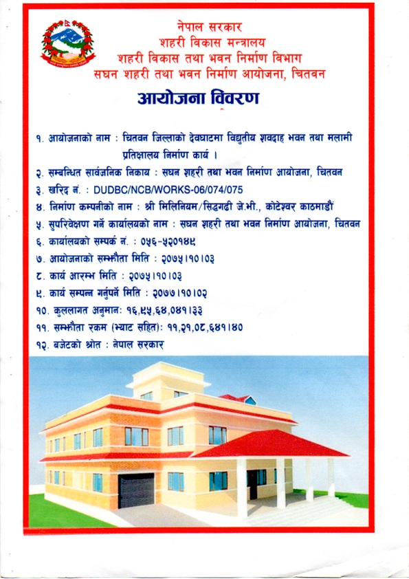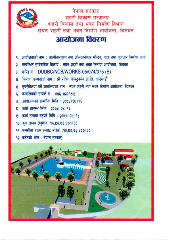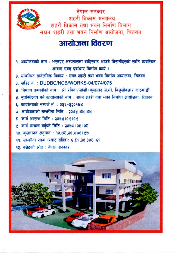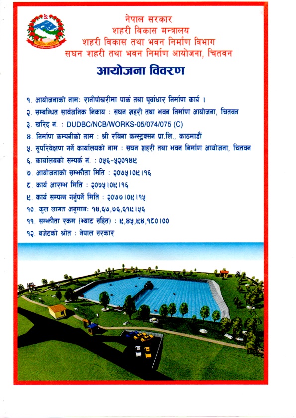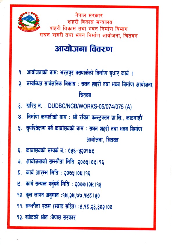 शहरी विकास मन्त्रालयको पाँच वटा अयोजनाहरुमा भरतपुर–९ स्थित केन्द्रीय वसपार्कको निर्माण सुधार गर्न रु १४ करोड २४ लाखको लागतमा रविना कन्स्ट्रक्सनलाई २ बर्षभित्र निर्माण सम्पन्न गर्ने गरी सम्झौता भएको छ । भरतपुर–६ स्थित लक्ष्मीनारायण तथा ओमर्काश्वर मन्दिर तथा पार्क निर्माण गर्न रविना कन्स्ट्रक्सनसँग रु १६ करोड ९२ लाख ४३ हजार लागतमा ठेक्का सम्झौता भएको छ । आयोजना अन्तरगत भरतपुर अस्पतालमा बिरामी कुरुवा घर निर्माण गर्न रु १० करोड ४८ लाख २६ हजार लागतमा रविना/जोशी/फुलजोर जेभी बिजुलीबजार काठमाडौँसँग २ बर्षभित्र निर्माण सम्पन्न गर्ने गरी सम्झौता भएको छ ।