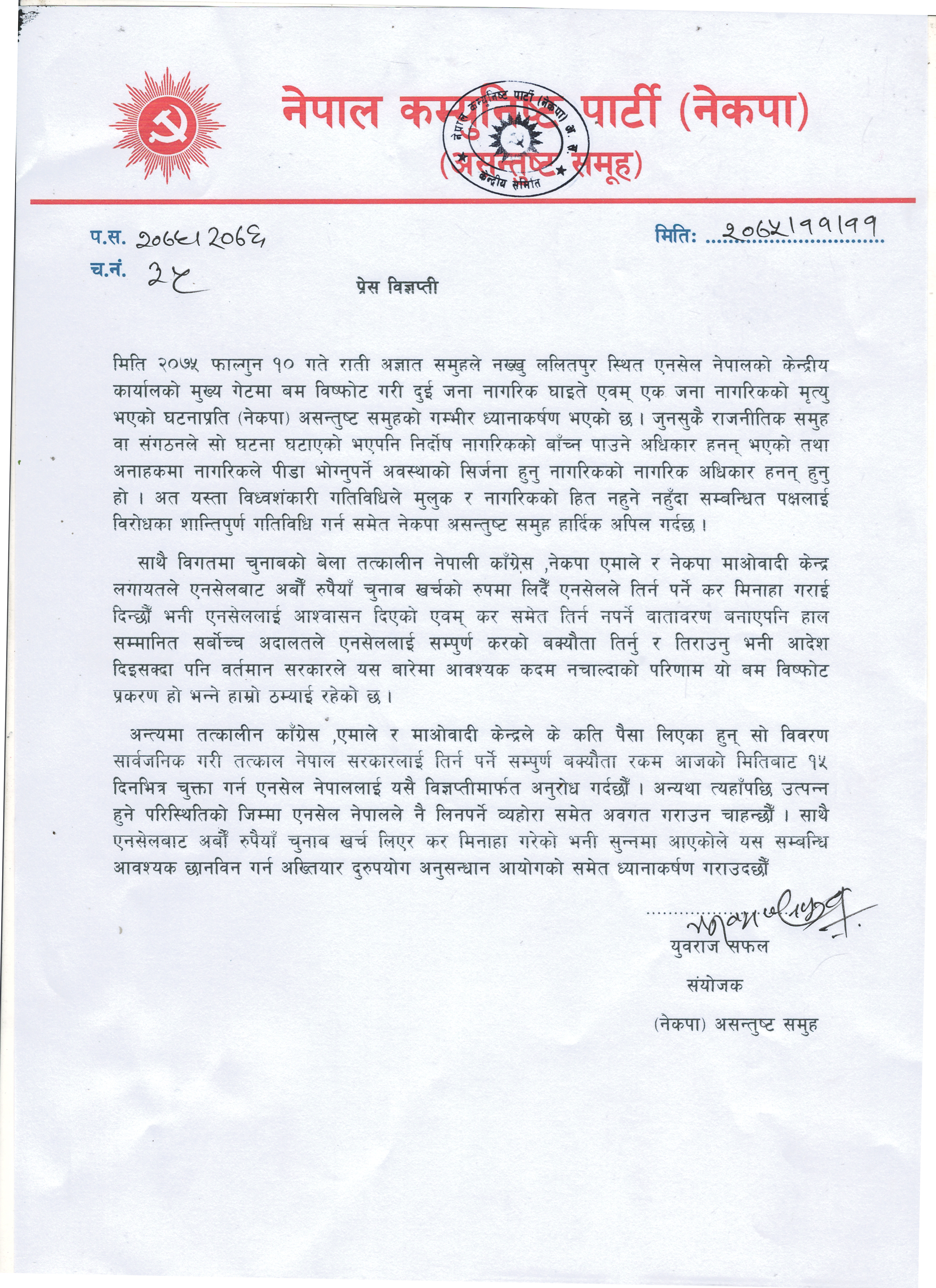 काठमाडौं । नेकपा असन्तुष्ट समूहले ललितपुर नख्खुस्थित एनसेल नेपालको केन्द्रीय कार्यालको मुख्य गेटमा भएको बम विष्फोटको घटनाप्रति गम्भीर ध्यानकर्षण भएको जनाएको छ ।