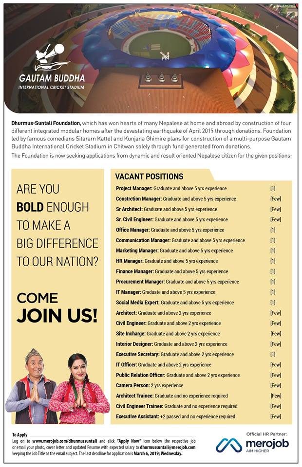 धुर्मुस सुन्तली फाउण्डेसनले खुल्ला गरेको आवेदनमा प्रोजेक्ट म्यानेजर, कन्स्ट्रक्सन म्यानेजर, अफिस म्यानेजर, कम्युनिकेसन म्यानेजर, मार्केटिङ म्यानेजर, एचआर म्यानेजर, फाइनान्स म्यानेजर, प्रोडक्सन म्यानेजर, आईटी म्यानेजर, सोसल मिडिया एक्स्पर्ट, सिभिल तथा आर्किटेक इञ्जिनियर, साइट इञ्चार्ज, इन्टेरियर डिजाइनर, एक्जिक्युटिभ सेक्रेटरी, आईटी अफिसर, पब्लिक रिलेसन अफिसर, क्यामरा पर्सन, एक्जिक्युटिभ असिस्टेन्ट लगायतका २३ शीर्षकमा नेपाली नागरिक भएका तथा अनुभवी व्यक्तिहरुको माग गरेको छ ।