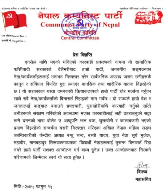 पार्टीका महासचिव विप्लवद्वारा बुधबार जारी विज्ञप्तिमा भनिएको छ, ‘गिरफ्तार गरिएका अखिल नेपाल महिला संघ क्रान्तिकारी केन्द्रीय अध्यक्ष बन्धु चन्द, बच्ची यादव, युवा नेता सूर्य भुजेल, महावीर, मानबहादुर तिरुवालगायतका विद्यार्थी नेताहरुलाई तुरुन्त विनासर्त रिहा नगरे हाम्रो पार्टी सशक्त आन्दोल गर्न बाध्य हुनेछ ।’
