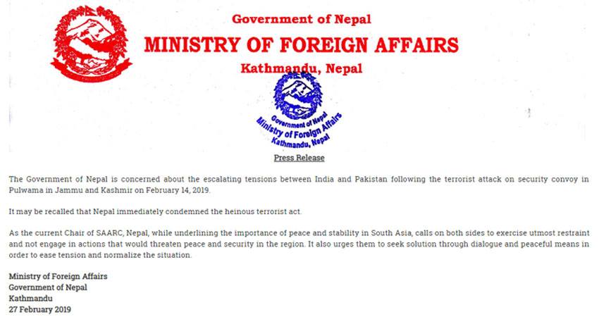 काठमाडौं । भारत र पाकिस्तानबीच बढ्दो तनाव र १४ फेब्रुअरीमा भएको जम्मु र कास्मरमा भएको आतंकवादी हमलाप्रति नेपाल सरकारको ध्यानाकर्षण भएको जनाइएको छ ।