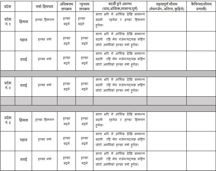 काठमाडौं । मौसम पूर्वानुमान महाशाखाले शुक्रबारदेखि बिहीबारसम्म सातै वटा प्रदेशको साप्ताहिक मौसमको पूर्वानुमान जारी गरेको छ ।