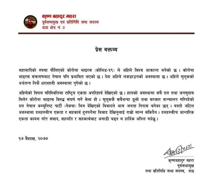 अहिलेको अवस्था राष्ट्रिय एकता अपरिहार्य उल्लेख गर्दै उनले विश्व नै कोरोना भाइरसको संक्रमणबाट आक्रान्त भईरहेका बेला नेपाल पनि यसबाट अछुतो नरहेकाले सबै मिल्नुको विकल्प नरहेको उल्लेख गरेका छन् । देश लकडाउनमा रहेकाले मुलुकको अर्थतन्त्र निकै धरासायी अवस्थामा पुगेको महराद्धारा हस्ताक्षरित विज्ञप्तीमा उल्लेख छ ।