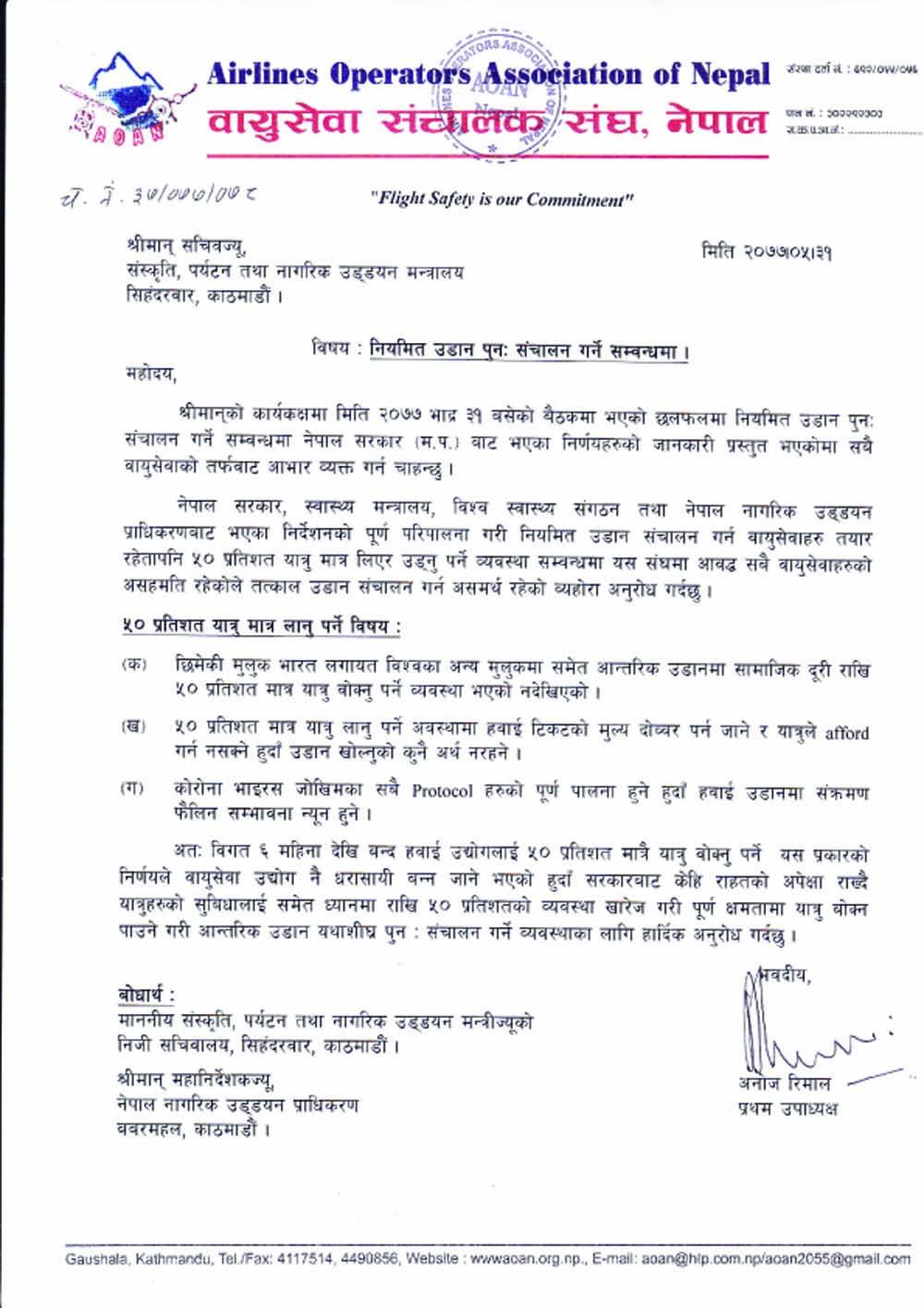 संघका प्रथम उपाध्यक्ष अनोज रिमालले छिमेकी मुलुक भारत लगायत विश्वका अन्य मुलुकमा सामाजिक दूरी राखेर सिट क्षमताको ५० प्रतिशतमात्रै यात्रु बोक्ने नियम नभएकाले आफूहरुले सरकारको यो व्यवस्था नमान्ने बताए ।