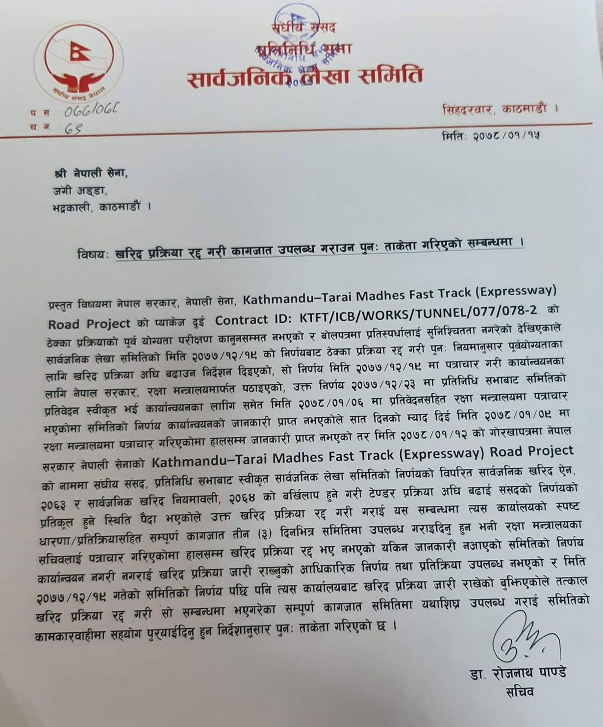 उनका अनुसार चैत १९ पछि लेखा समितिले ६ वैशाख र ९ वैशाखमा रक्षा मन्त्रालयलाई पत्र लेखेर फाष्ट ट्रयाकको दोस्रो प्याकेजको सुरुङ र पुल निर्माणसम्बन्धि खरिद प्रक्रिया रोक्न भनेको थियो । तर, सेनाले चैत १९ गते समितिले दिएको निर्देशन उल्लंघन गर्दै वैशाख १२ गते टेण्डर आव्हानको सार्वजनिक सूचना निकालेको छ ।