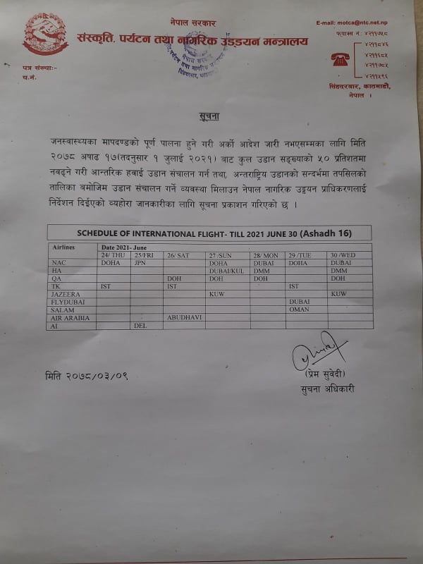 काठमाडौं । जनस्वास्थ्य मापदण्ड पालना गर्दै आन्तरिक र अन्तर्राष्ट्रिय हवाई उडान सञ्चालन हुने भएको छ । आन्तरिक उडान असार १७ गतेदेखि संचालन हुने भएको छ भने अन्तर्राष्ट्रिय उडान भने बिहीबारदेखि सुरु हुने भएको छ ।
