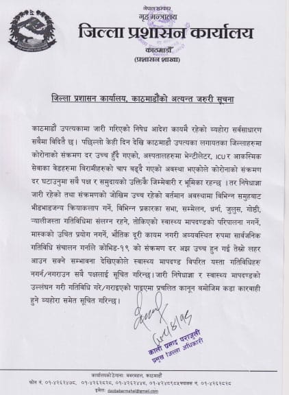 काठमाडौँ । जिल्ला प्रशासन कार्यालय काठमाडौँले पछिल्लो समय कोरोना भाइरसको संक्रमण बढ्दै गएको भन्दै सभा, सम्मेलन, धर्ना, जुलुस, गोष्ठी जस्ता कार्यक्रम नगर्न आग्रह गरेको छ।
