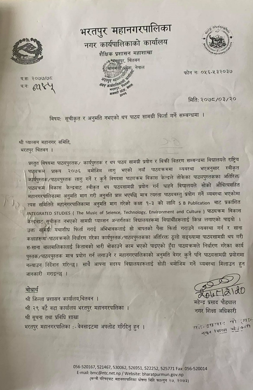 निजी विद्यालयले मात्रै होईन विद्यालयहरुको छाता संगठनले पनि बदमासी गरेको पाईएको छ । निजी विद्यालयहरुको संगठन प्याब्सनले आफना विद्यालयहरुमा स्वीकृत नभएको पाठ्यक्रम लगाएर विद्यार्थीलाई किन्न बाध्य बनाएको भेटिएको छ । प्याब्सनले नियम बिपरित कार्य गरेको पाईएपछि महानगरले प्याब्सन महानगर समितिलाई पत्रनै काटेर स्वीकृत र अनुमति नभएको पाठ्य सामाग्रि नपढाउन र विद्यार्थीबाट फिर्ता गर्न निर्देशन नै दिएको छ । नगर शिक्षा अधिकारी महेन्द्र प्रसाद पौडयालले पत्र काटेर प्याब्सनलाई यस्तोे निर्देशन दिएका हुन् । प्याब्सनले आफु मातहतका विद्यालयहरुले पाठ्यक्रम विकास केन्द्र र स्थानिय तहबाट स्वीकृत नभएको पाठ्यपुस्तक लागु नगराउन र पुस्तक फिर्ता गरि अभिभावकलाई पैसा समेत फिर्ता गर्न पनि आफुहरुले निर्देशन दिएको पौड्यालको भनाई छ । त्यस्तै साना बालबालिकालाई किताबको भारी नबोकाउन पनि विद्यालयहरुलाई महानगरले निर्देशन गरेको छ ।