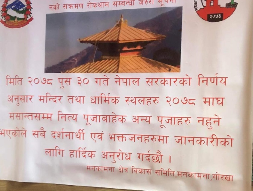 गोरखा । गोरखाको मनकामना मन्दिर शुक्रबारदेखी बन्द हुने भएको छ । मनकामना क्षेत्र बिकास समितिको आज बसेको बैठकले नेपाल सरकार प्रधानमन्त्री तथा मन्त्रिपरिषद्को कार्यालयले पौष ३० गते गरेको निर्णय अनुसार नै मन्दिरमा शुक्रबारदेखी नृत्य पूजा गरी सर्व साधारणलाई मन्दिर प्रवेशमा रोक लगाउने निर्णय भएको समितिका कार्यकारी निर्देशक लेबेन्द्र गुरुङले बताए ।