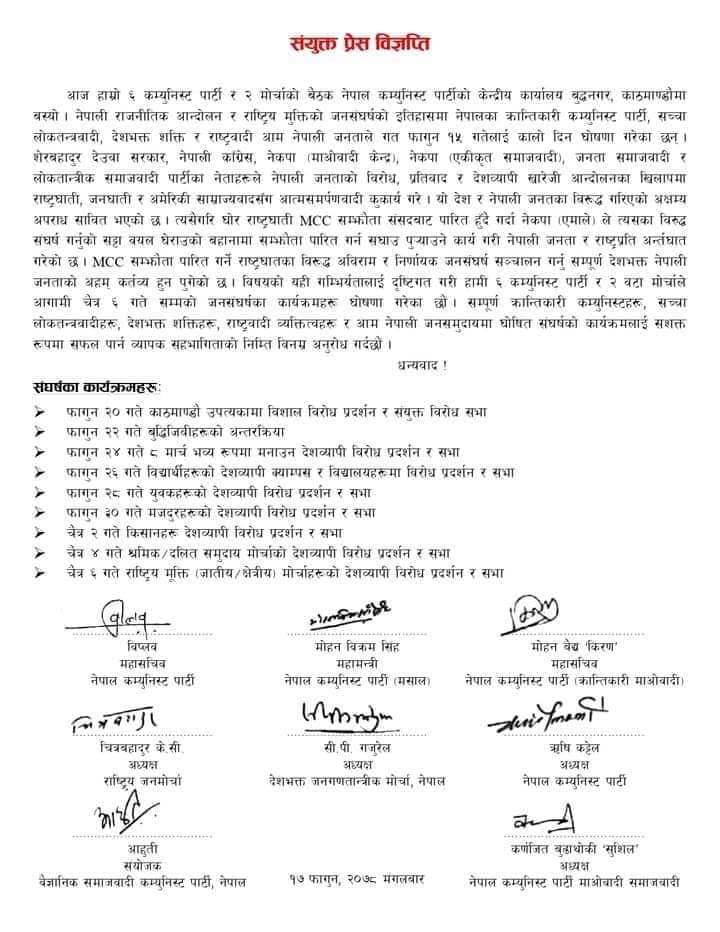 काठमाडौं । विभिन्न ६ कम्युनिष्ट राजनीतिक दल र दुई मोर्चाले फागुन २० गतेदेखि चैत ६ गतेसम्म संघर्षका कार्यक्रम घोषणा गरेका छन् ।मंगलबार काठमाडौंको बुद्धनगरस्थित नेपाल कम्युनिष्ट पार्टीको कार्यालयमा बसेको आठ संगठनको बैठकले एमसीसी पारित भएको विरोधमा प्रर्दशनको कार्यक्रम घोषणा गरेको हो ।